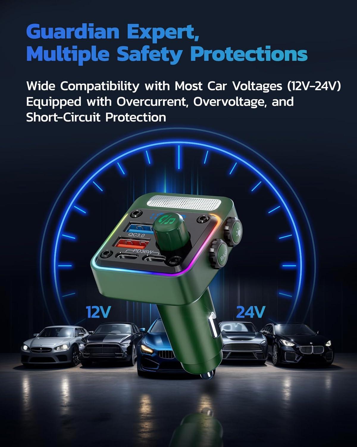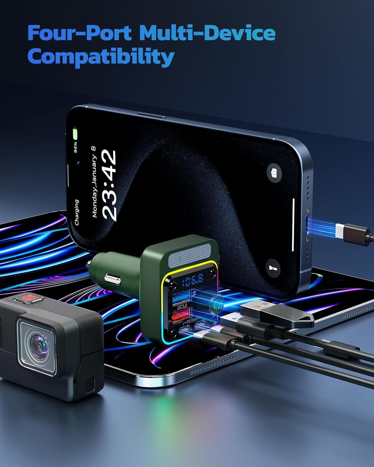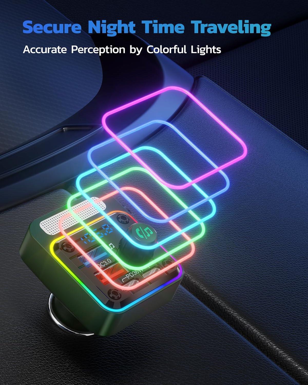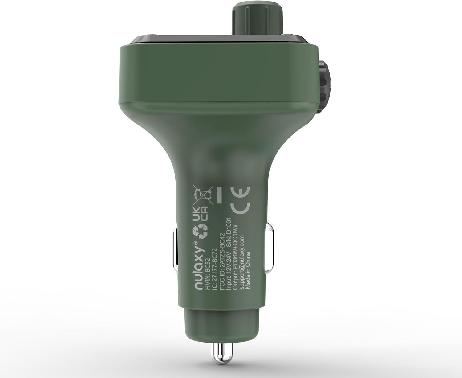Nulaxy 54W Bluetooth 5.3 Car Adapter Charger 4-Port Fast Charging [PD36W & QC3.0 18W], Wireless Radio FM Transmitter with Deep Bass Player, 5 Colors LED Backlit, Hands-Free Calling, Support USB Drive(Green)