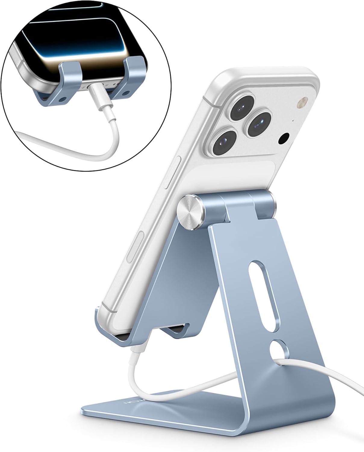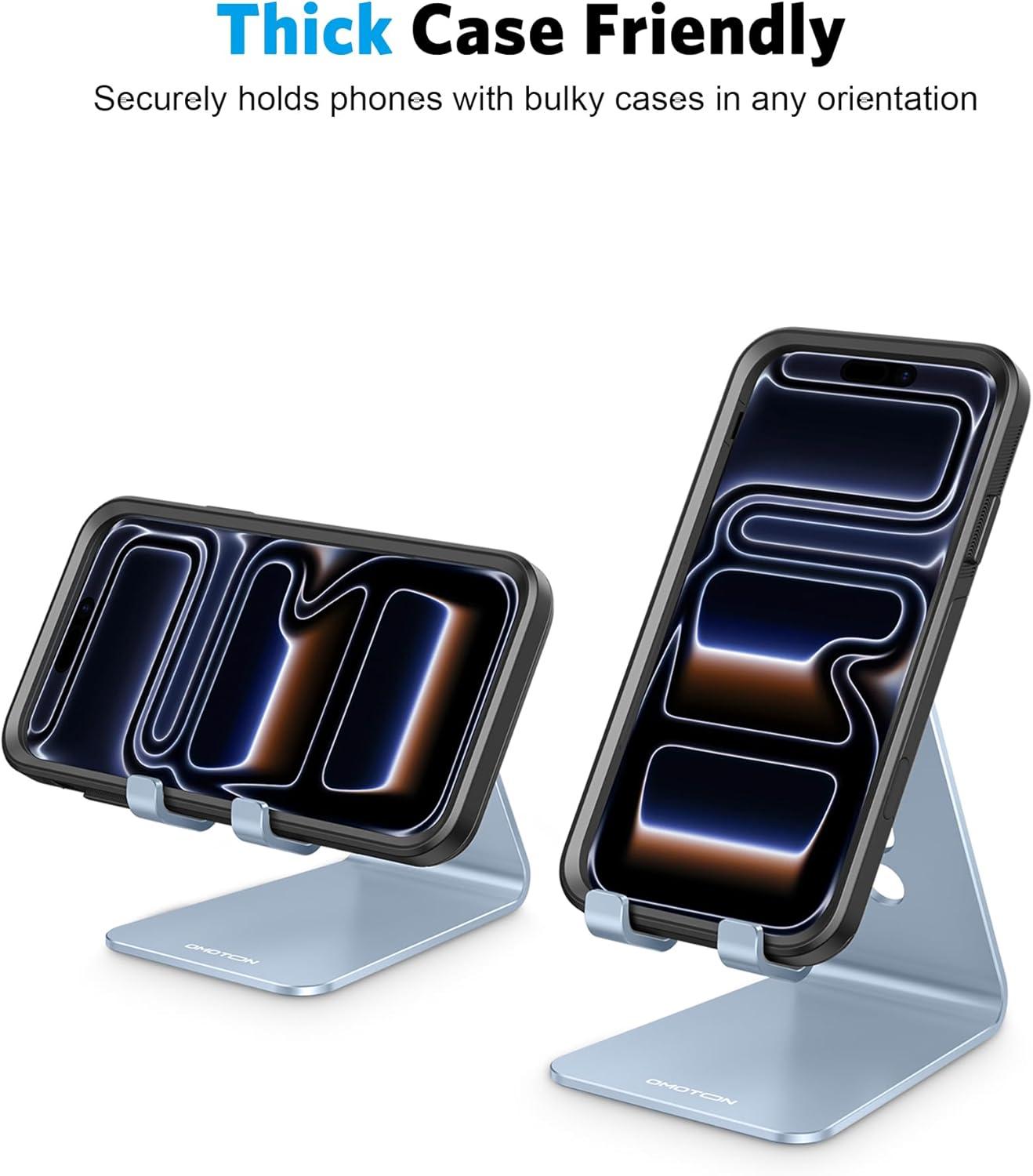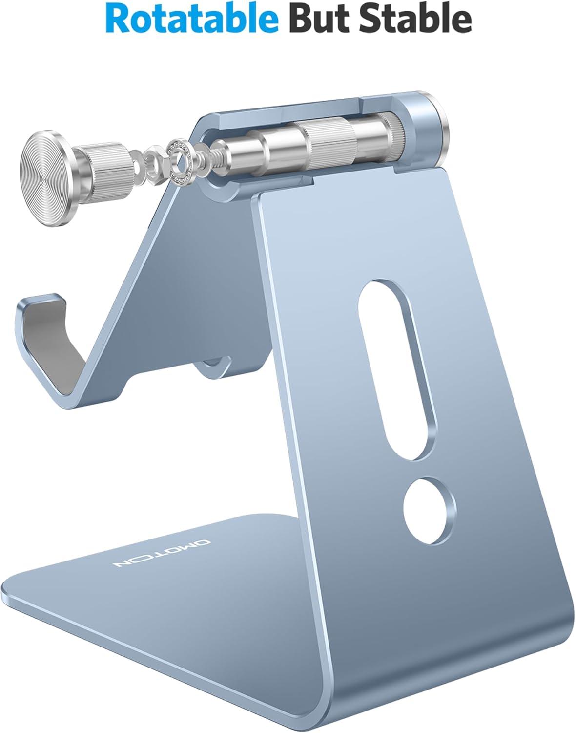 OMOTON Adjustable Cell Phone Stand, C2 Aluminum Desktop Phone Holder Dock Compatible with iPhone 15 14 13 Xs XR 8 Plus 7 6, Samsung Galaxy, Google Pixel, Android Phones, Black(Light Blue)
