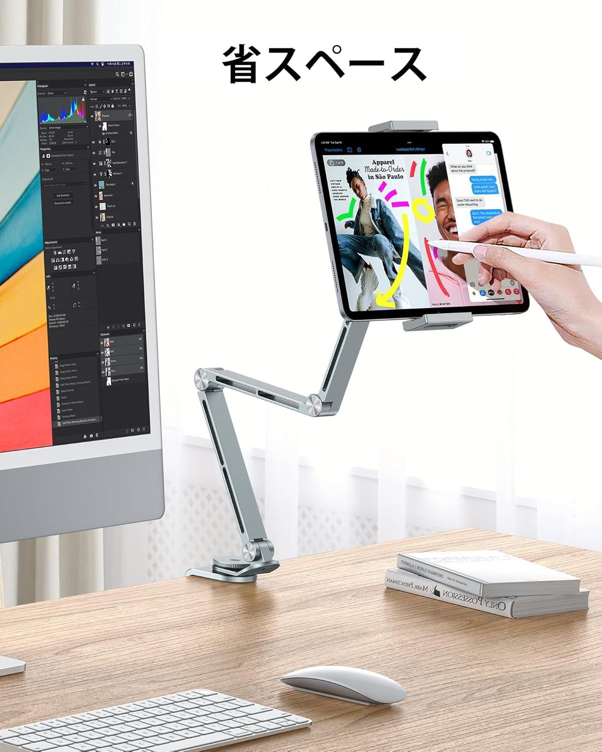 OMOTON Aluminum Tablet Stand for iPad, Adjustable Phone Stand for Desk 360° Rotation with 2 Clips [Phone & Tablet], Gooseneck Overhead Phone Mount for Bed Compatible with All Device up to 12″