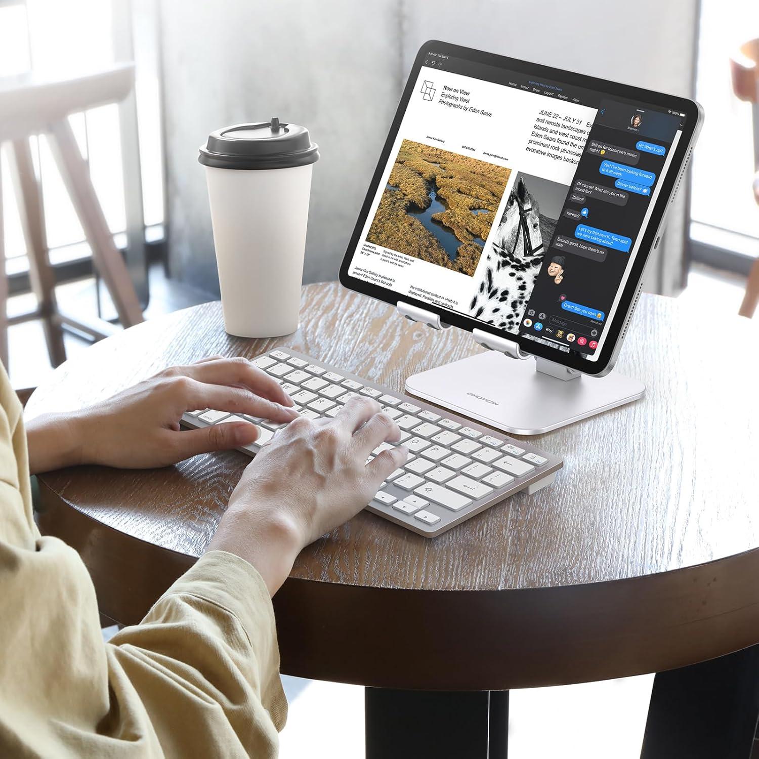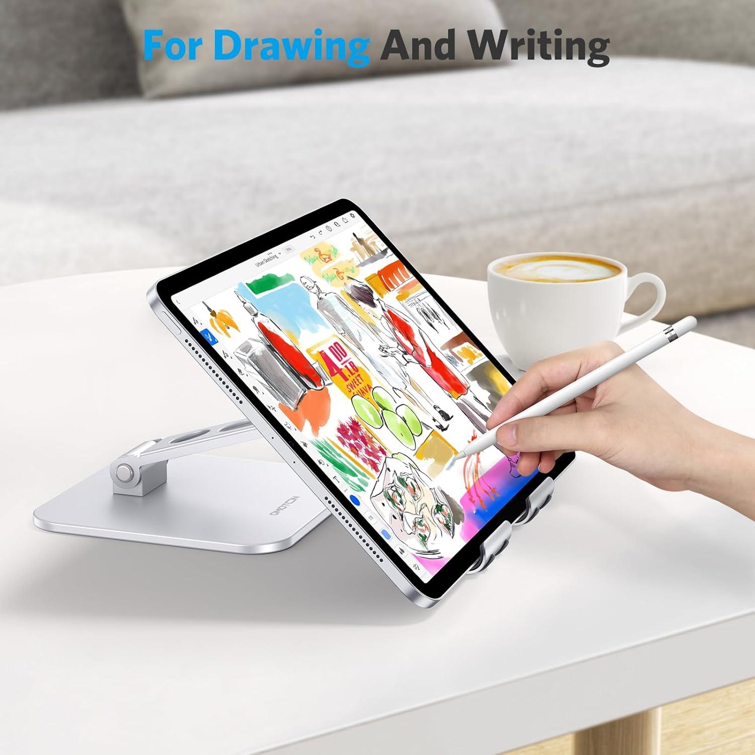【Broad compatibility】 This adjustable tablet stand for desk is compatible with a broad range of devices, including iPad Pro 12.9/11, iPad Air/mini 6 5 4 3 2, portable monitor, Samsung Galaxy Tabs, Surface, Surface Pro, drawing tablet and much more.