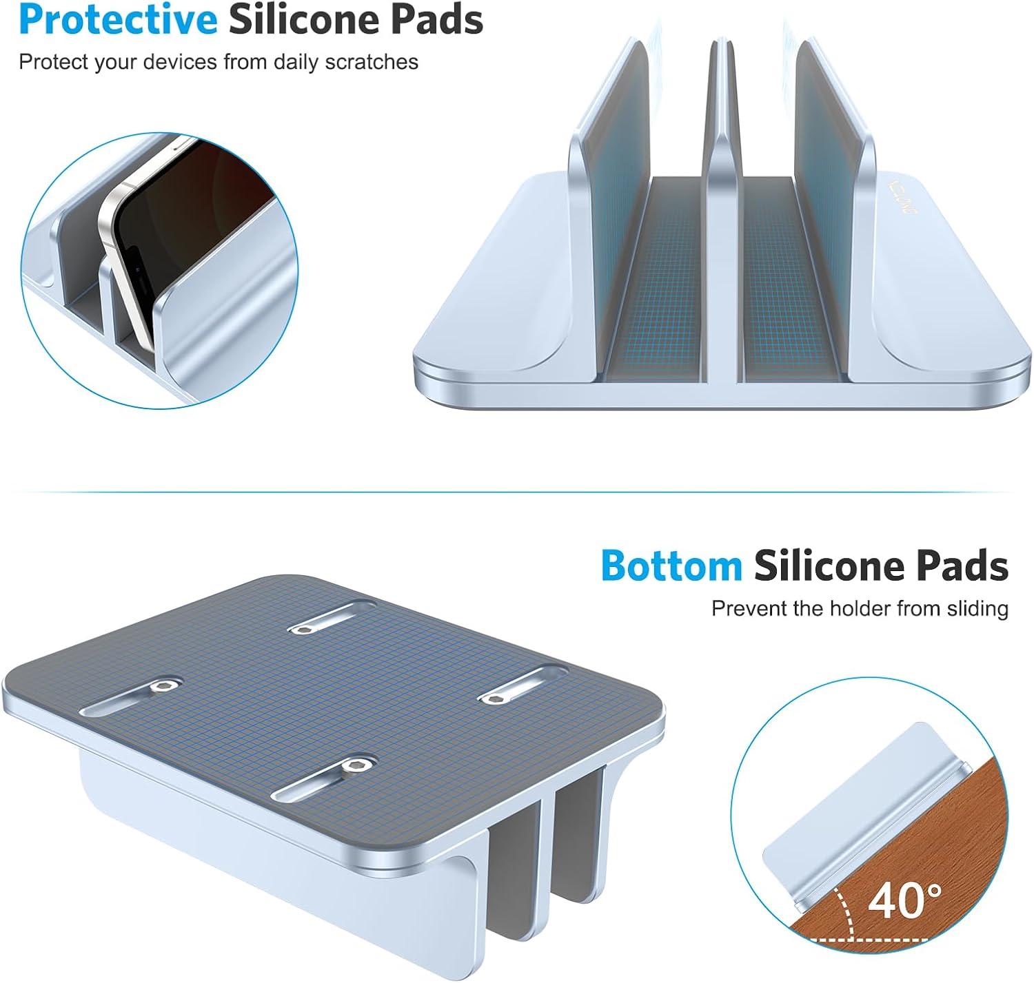 Protective Mat: Non-toxic and non-slip silicone mats cover the laptop slots to avoid scratches on your devices; non-slip silicone pads pads on the base ensure stability and security.
