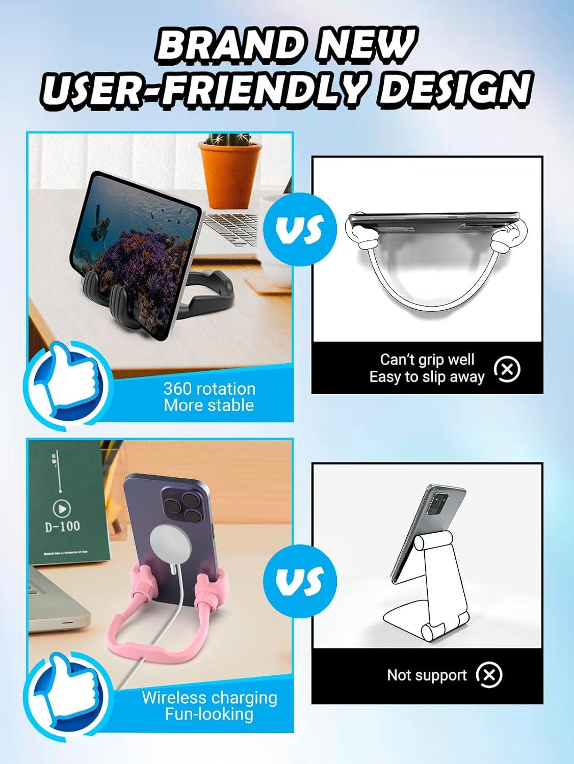 Patent 360° Rotation & Adjustable Angle Design: CALDEVER phone holder featuring a patent 360° rotatable structure and unique adjustable “wrist” angle, a true innovative upgrade; Effortlessly switch between horizontal and vertical viewing, finding your perfect multi-angle from 0-40° for video calls, movies, or online classes; This universal cell phone stand with its widened and thickened base ensures enhanced stability and greater compatibility for Phone, iPad mini, Samsung, and most devices