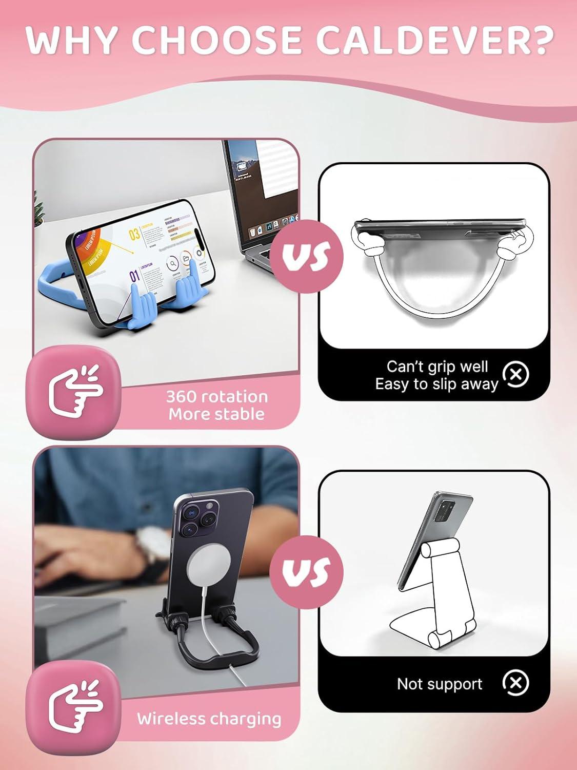 Seamlessly Wireless Charging with Confidence Customer Service: Designed with a convenient bottom opening, our “Shy” gesture thumbs phone holder allows you to charge your device while enjoying hands-free use wirelessly. CALDEVER is committed to your satisfaction, offering dedicated customer service and support. Experience the blend of innovative design and reliable performance with the CALDEVER versatile cell phone holder desk